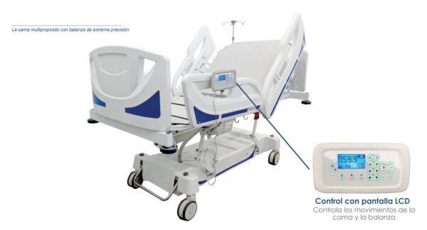 • La cama , esta equipada para cumplir las más altas exigencias de una UCI, nuestra cama multipropósito incorpora un sistema eléctrico de balanza para poder medir el peso del paciente con una precisión de +/- 100 gramos.